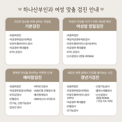 하나산부인과는 프라이빗한 분위기에서 아름답고 건강한 삶을 영위할 수 있도록 세심한 진료해드리겠습니다.